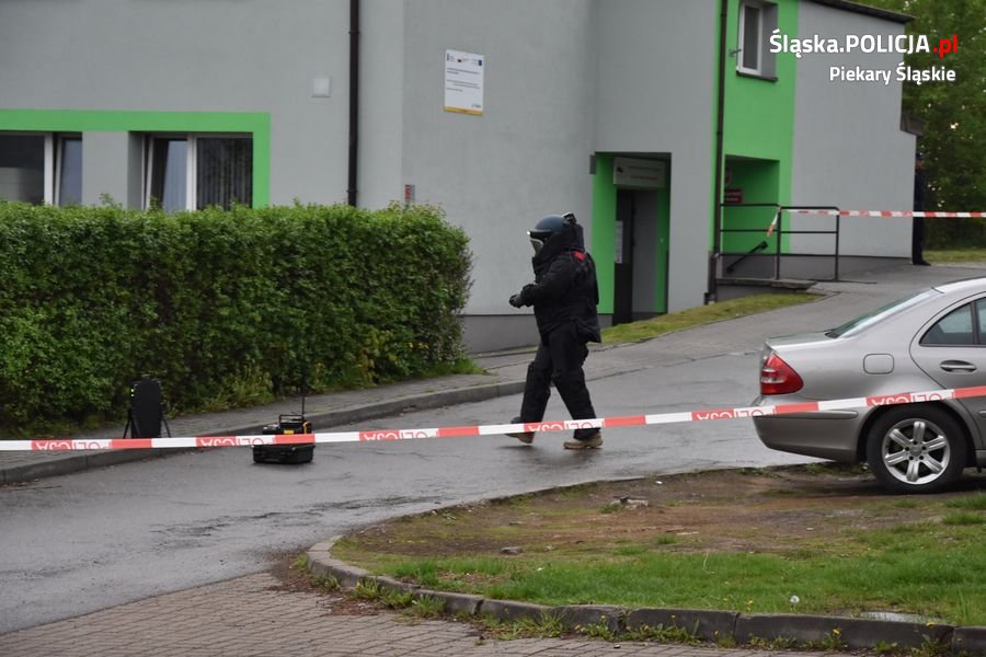 Wczoraj około godziny 14.00 dyżurny piekarskiej jednostki otrzymał zgłoszenie od kobiety, która zauważyła przyczepiony pod swój samochód pakunek nieznanego pochodzenia. Przybyli na miejsce piekarscy policjanci zabezpieczyli pobliski teren oraz powiadomili kolegów z Samodzielnego Pododdziału Kontrterrorystycznego Policji w Katowicach, oraz przewodnika z psem służbowym wykorzystywanym do wykrywania materiałów wybuchowych. Z pobliskiego Powiatowego Urzędu Pracy ewakuowano 35 osób. Po wykonaniu wszystkich czynności przez mundurowych okazało się, że podejrzanym przedmiotem był nadajnik GPS.