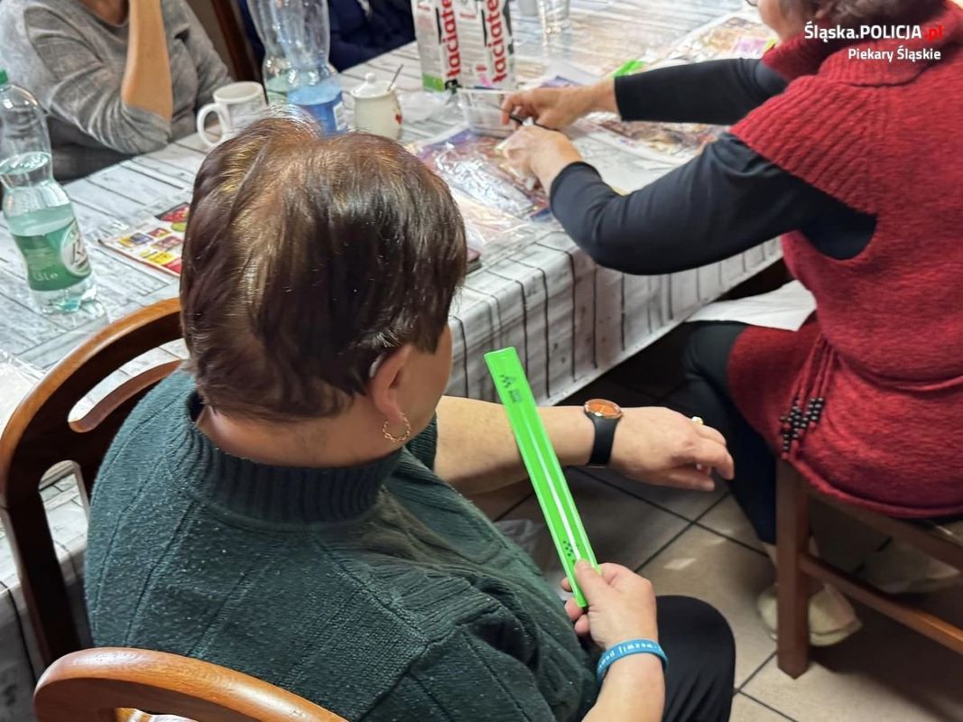 W ramach akcji „Świeć przykładem – nos odblaski”, uczestnikom rozdano odblaskowe opaski. Seniorzy zostali zachęceni do noszenia ich zwłaszcza podczas spacerów w sezonie jesienno-zimowym, kiedy widoczność jest ograniczona. Mundurowi podkreślili, jak istotne jest, aby zadbać o własne bezpieczeństwo na drodze.