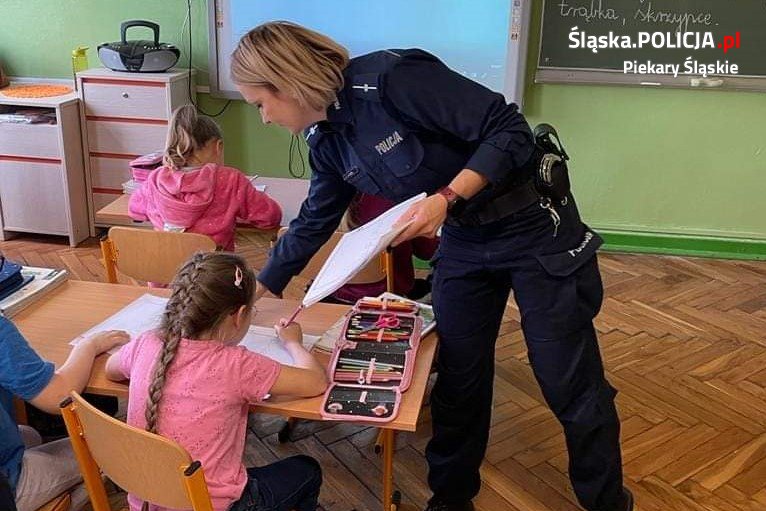 mł. asp. Aleksandra Zydyk zajmująca się profilaktyką społeczną w piekarskiej komendzie prowadzi cykl spotkań z uczniami szkół podstawowych. Podczas prowadzonych zajęć mundurowa wyświetla krótkie filmy animowane i omawia sytuacje, w których dzieci spotykają obce osoby.