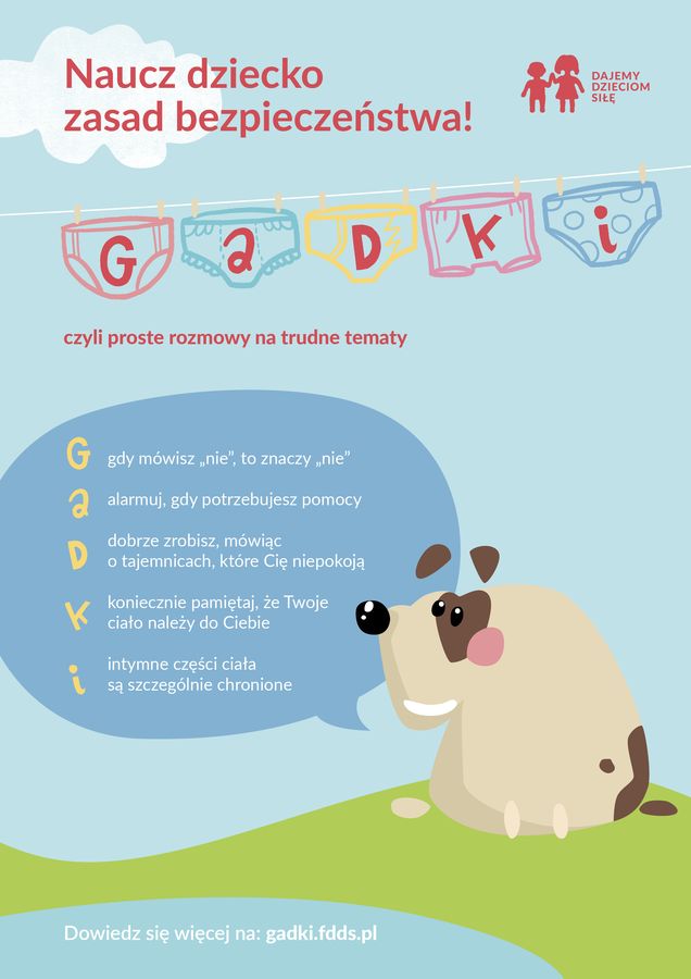 GADKI wyznaczają kierunki rozmowy na temat kilku prostych zasad, które mogą ochronić dziecko przed wykorzystywaniem. Dzieci dowiadują się z nich, że to one decydują o swoim ciele, mają prawo, żeby na coś się nie zgodzić, a gdy są zaniepokojone lub zmartwione, powinny szukać pomocy. Każda z liter wchodzących w skład słowa GADKI odnosi się do wskazówki, która pomaga dziecku uniknąć niebezpieczeństwa: