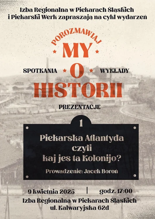 Premierowa odsłona cyklu odbędzie się pod hasłem „Piekarska Atlantyda, czyli kaj jes ta Kolonijo”. Spotkanie poprowadzi Jacek Boroń – znany lokalny pasjonat historii, kolekcjoner pamiątek oraz autor profilu Piekary Śląskie w Obiektywie.