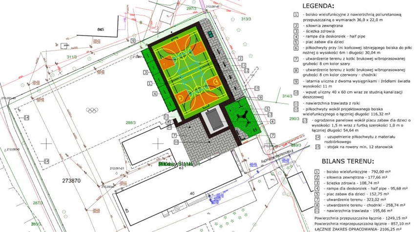 W ramach projektu powstaje boisko wielofunkcyjne o nawierzchni poliuretanowej i wymiarach 22 x 36 m. Nawierzchnia wraz z podbudową stanowią warstwy przepuszczalne dla wody. W jego obrębie zlokalizowane zostaną: boisko do piłki ręcznej/nożnej o polu gry 32 x 18 m, boisko do koszykówki – dwa obiekty o wymiarach 15 x 21 m każdy, a także boisko do siatkówki o rozmiarze 18 x 9 m. Całość zostanie wyposażona w niezbędną infrastrukturę boiskową, w tym piłkochwyty o wysokości 6 metrów.