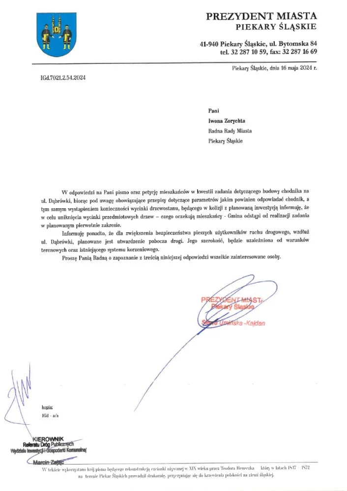 W odpowiedzi na Pani pismo oraz petycję mieszkańców w kwestii zadania dotyczącego budowy chodnika na ul. Dąbrówki, biorąc pod uwagę obowiązujące przepisy dotyczące parametrów jakim powinien odpowiadać chodnik, a tym samym wystąpieniem konieczności wycinki drzewostanu, będącego w kolizji z planowaną inwestycją informuję, że w celu uniknięcia wycinki przedmiotowych drzew – czego oczekują mieszkańcy – Gmina odstąpi od realizacji zadania w planowanym pierwotnie zakresie” – poinformowała w piśmie do radnej Zorychty i jednocześnie osób, które podpisały petycję Sława Umińska-Kajdan – Prezydent Piekar Śląskich.