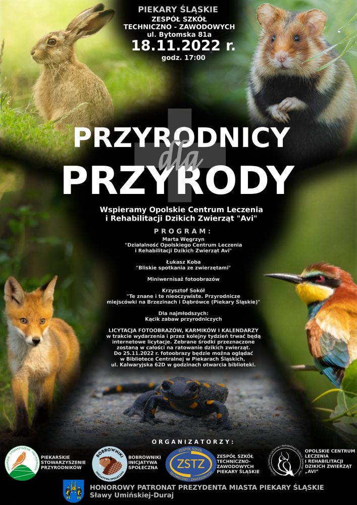 Piekarskie Stowarzyszenie Przyrodników, Bobrowniki Inicjatywa Społeczna, Zespół Szkół Techniczno-Zawodowych w Piekarach Śląskich i Opolskie Centrum Leczenia i Rehabilitacji Dzikich Zwierząt „Avi” zapraszają do akcji “Przyrodnicy dla Przyrody”, która odbędzie się 18 listopada 2022 r. o godz. 17.00 w Zespole Szkół Techniczno-Zawodowych w Piekarach Śląskich przy ul. Bytomskiej 81a.