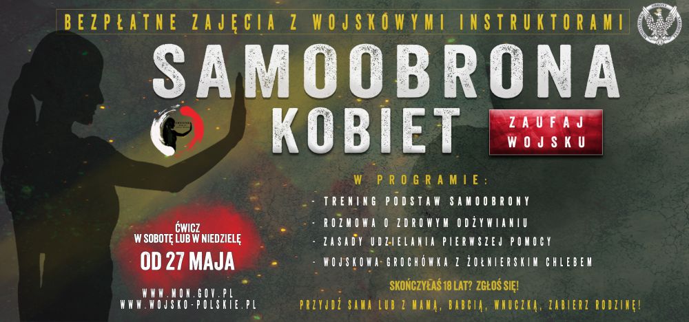 Ministerstwo Obrony Narodowej wraz z Centralnym Wojskowym Centrum Rekrutacji i Dowództwem Generalnym Rodzajów Sił Zbrojnych organizuje bezpłatne szkolenia z samoobrony dla dorosłych Polek. Szkolenia z doświadczonymi żołnierzami – instruktorami odbywać się będą w wybrane soboty i niedziele wiosną i latem w parkach miejskich, na plażach, w ośrodkach sportu i rekreacji na terenie całej Polski. W dniach 5-6 sierpniu szkolenie odbędzie się w Piekarach Śląskich.
