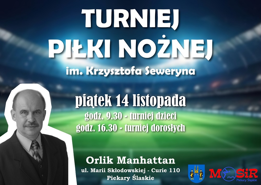 W piątek 14 listopada zapraszamy na Turniej Piłki Nożnej im. Krzysztofa Seweryna na Orliku Manhattan. Zawody rozpoczną się o godzinie 9:30 dla dzieci roczników 2018/2019, a o 16:30 rozpocznie się turniej dla dorosłych. To doskonała okazja do rywalizacji na świeżym powietrzu i oddania hołdu znanemu sportowcowi.