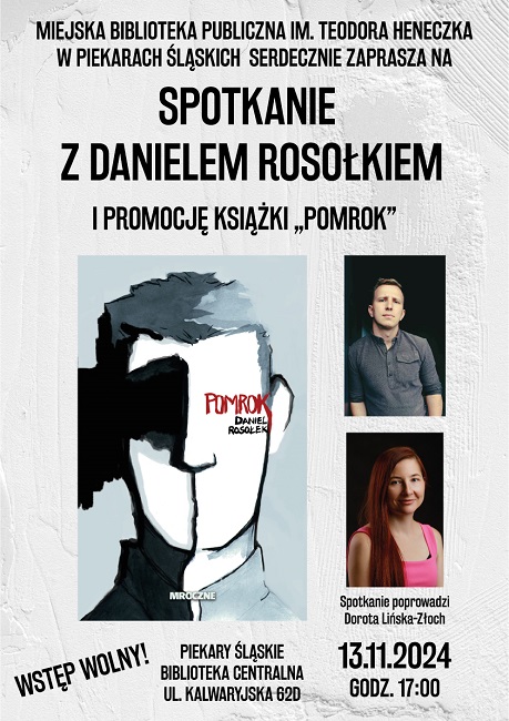 13 listopada 2024 roku o godz. 17:00 w Bibliotece Centralnej przy ul. Kalwaryjskiej 62D odbędzie się spotkanie autorskie z Danielem Rosołkiem, znanym pisarzem pochodzącym z Zabrza. Rosołek, którego fascynują historia i psychologia człowieka, tworzy wyjątkowe powieści, w których łączy realizm z elementami fantastycznymi. Jego najnowsza książka „Pomrok” to przejmująca opowieść o powojennym zniszczeniu i odbudowie człowieczeństwa.