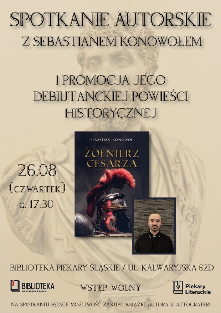 Na piekarskiej mapie literackiej pojawił się nowy autor związany z tym miastem, dlatego Miejska Biblioteka Publiczna im. Teodora Heneczeka w Piekarach Śląskich z ogromną przyjemnością zaprasza na spotkanie promujące debiutancką książkę Sebastiana Konowoła pt. “Żołnierz cesarza”. Jest to powieść historyczna osadzona w starożytnym Rzymie w okresie panowania cesarza Septymiusza Sewera i jego następców – synów: Karakalli i Gety.