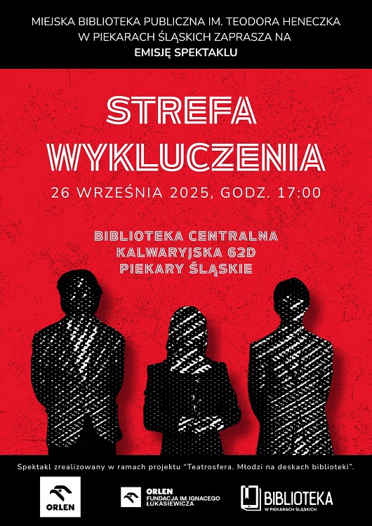Miejska Biblioteka Publiczna im. Teodora Heneczka w Piekarach Śląskich zaprasza na wyjątkowe wydarzenie podsumowujące projekt „Teatrosfera”. Już 26 września o godz. 17:00 odbędzie się spektakl „Strefa Wykluczenia”, który będzie zaprezentowany w formie teatru telewizji.