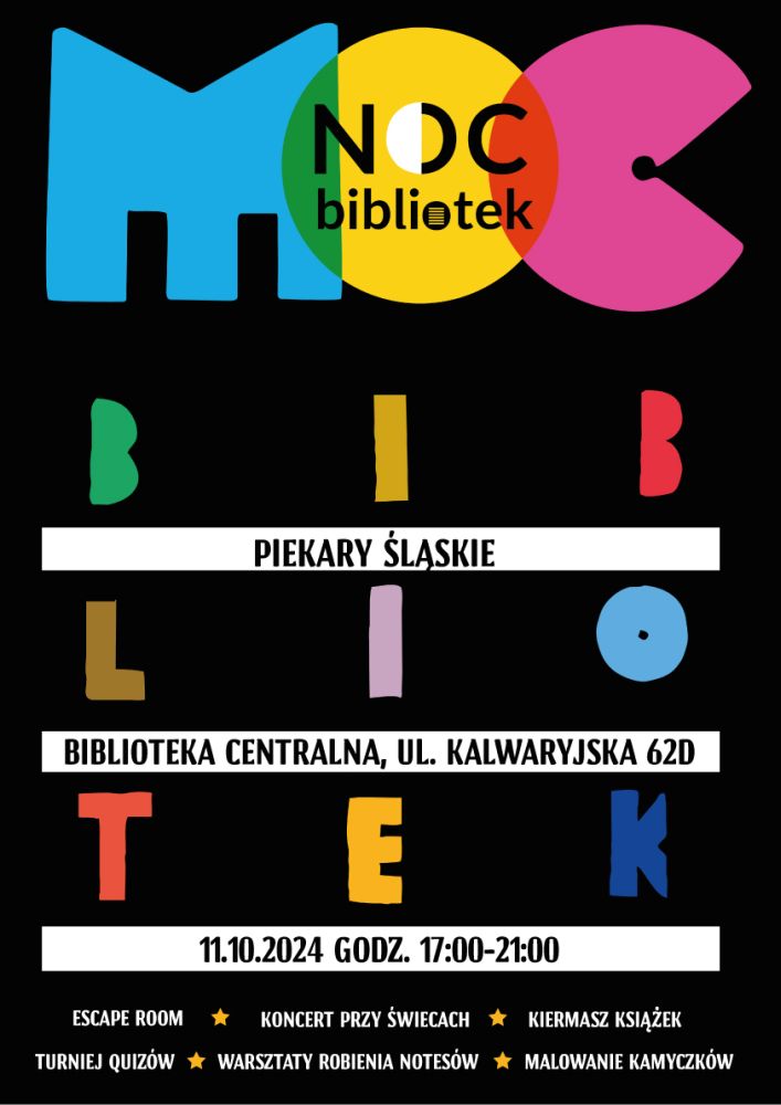 11 października 2024 Biblioteka Centralna będzie wyjątkowo czynna w godz. 13:00-21:00. W trakcie trwania Nocy Bibliotek wyłączona będzie czytelnia oraz oddział dziecięcy. Będzie można natomiast swobodnie korzystać z wypożyczalni.