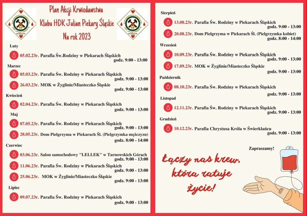 Stowarzyszenie Honorowych Dawców Krwi Rzeczypospolitej Polskiej KWK „Julian” ogłosiło harmonogram akcji poboru krwi w 2023 roku.