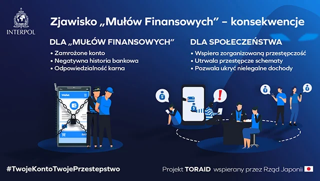 Grupy przestępcze często wykorzystują proceder „prania pieniędzy” w celu ukrycia pochodzenia nielegalnych środków. Celem jest wywołanie wrażenia legalności przestępczych aktywów, a w konsekwencji uniknięcie odpowiedzialności karnej. Proceder taki w rezultacie utrudnia organom ścigania identyfikowanie i śledzenie transferów środków. W celu podkreślenia tego zagrożenia, INTERPOL organizuje kampanię #TwojeKontoTwojePrzestepstwo. 2-tygodniowa kampania (10-26 sierpnia 2022 r.) zwiększy świadomość na temat „mułów finansowych” oraz podpowie, jak uniknąć tego zagrożenia.