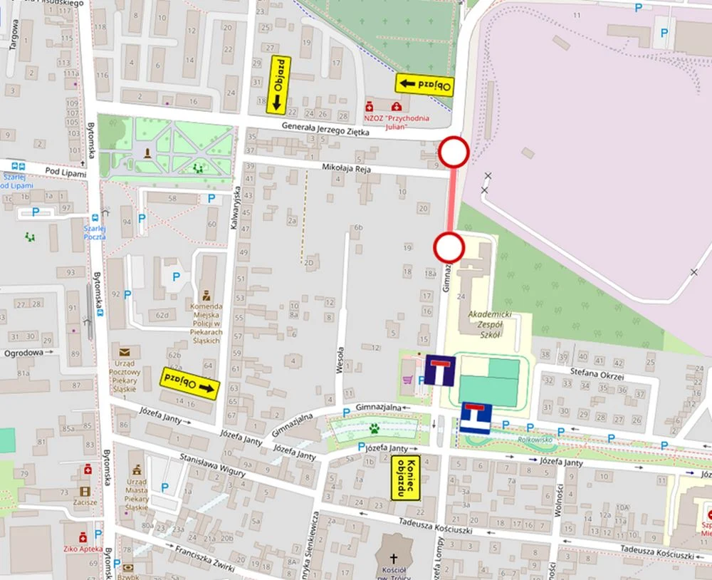 W związku z powyższym wprowadzona zostaje tymczasowa zmiana organizacji ruchu na ulicy Gimnazjalnej poprzez jej zamknięcie na odcinku wykonywanych robót. Objazd zostanie poprowadzony ulicami Gen. Jerzego Ziętka, Kalwaryjską oraz Józefa Janty.