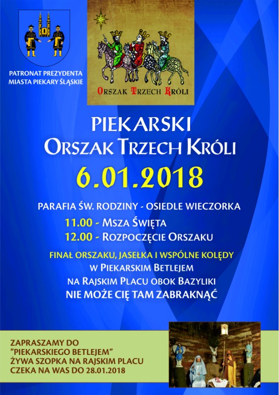 Piekarski Orszak Trzech Króli rozpocznie się mszą świętą, a następnie o godz. 12:00, przed kościołem Świętej Rodziny przy ul. Konstytucji 3-go Maja, rozpocznie się przemarsz. Uczestnicy Orszaku przejdą ulicami: Konstytucji 3-go Maja, Ziętka, Papieża Jana Pawła II i Bytomską, a zakończenie odbędzie się na Rajskim Placu przy Bazylice.