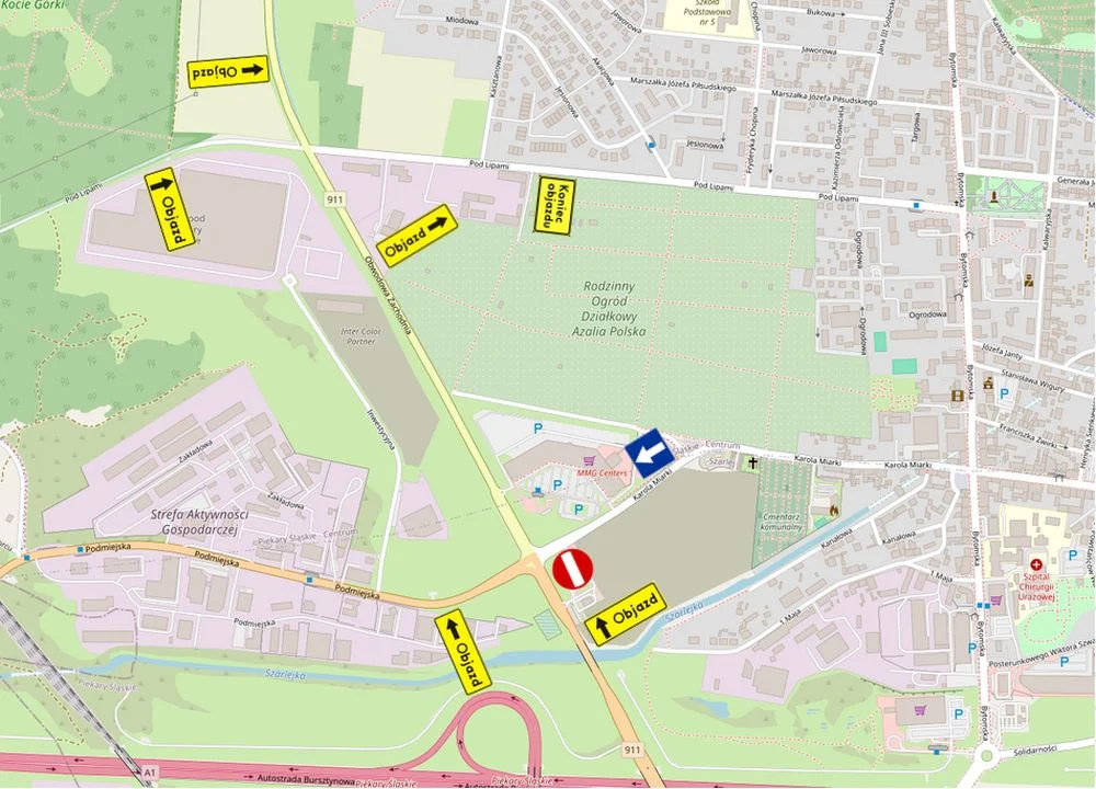 Dojazd od strony skrzyżowania do Centrum, zostanie poprowadzony trasą objazdu tj. DW-911 i ulicą Pod Lipami. Planowana zmiana według zapewnień wykonawcy potrwa maksymalnie do końca maja br.