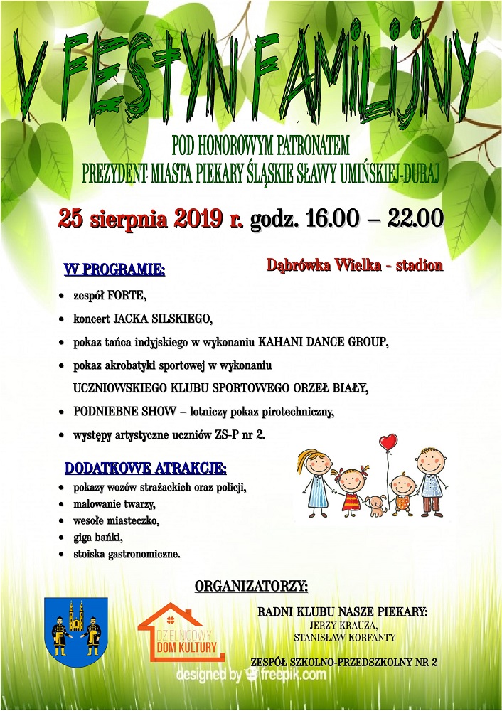 Radni z Klubu Nasze Piekary, Zespół Szkolno-Przedszkolny nr 2 oraz Dzielnicowy Dom Kultury zapraszają na V Festyn Familijny w Dąbrówce Wielkiej. Wydarzenie to odbędzie się pod honorowym patronatem Prezydent Miasta Piekary Śląskie Sławy Umińskiej-Duraj.