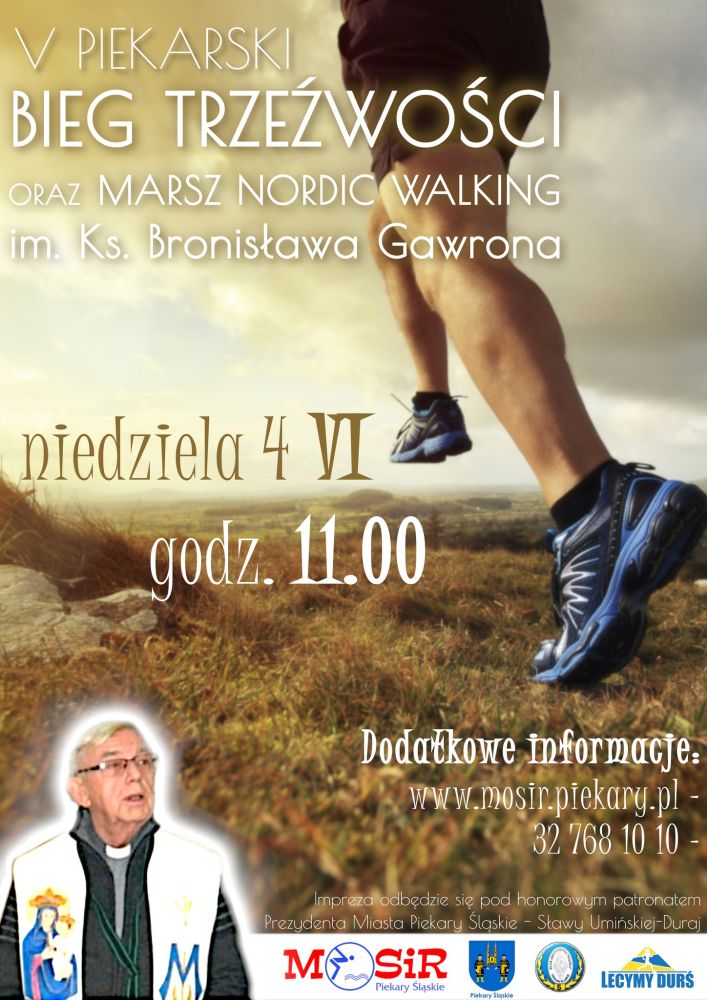 W niedzielę 4 czerwca odbędzie się V Piekarski Bieg Trzeźwości oraz Marsz Nordic Walking im. ks. Bronisława Gawrona. Bieg rozpocznie się o godz. 11.00 na stadionie piekarskiego MOSiR-u przy ul. Olimpijskiej 3.