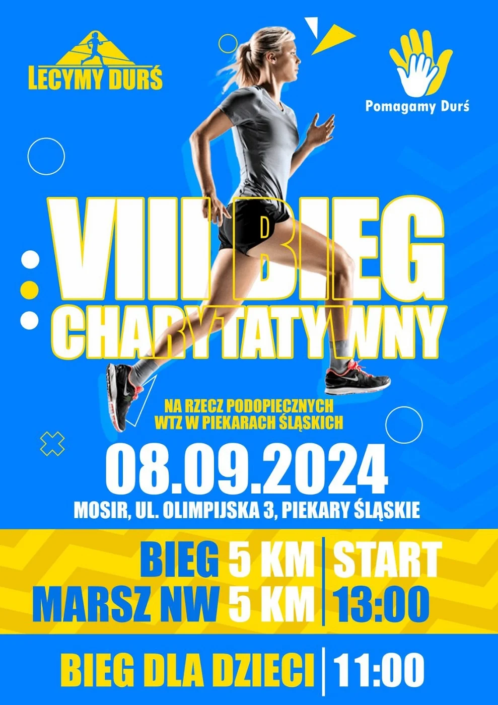 Stowarzyszenie „Lecymy Durś” zaprasza na VIII Bieg Charytatywny “Pomagamy Durś” na rzecz podopiecznych Warsztatów Terapii Zajęciowych w Piekarach Śląskich.