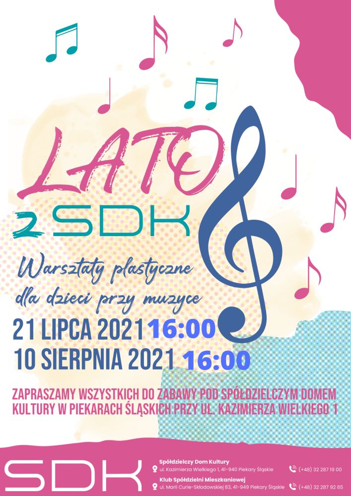 Osoby poszukujące propozycji dla swoich pociech mogą skorzystać z propozycji Spółdzielczego Domu Kultury. 10 sierpnia 2021 roku, o godzinie 16:00 przy ul. Kazimierza Wielkiego 1, gdzie mieści się SDK, odbędą się “Warsztaty plastyczne przy muzyce”.