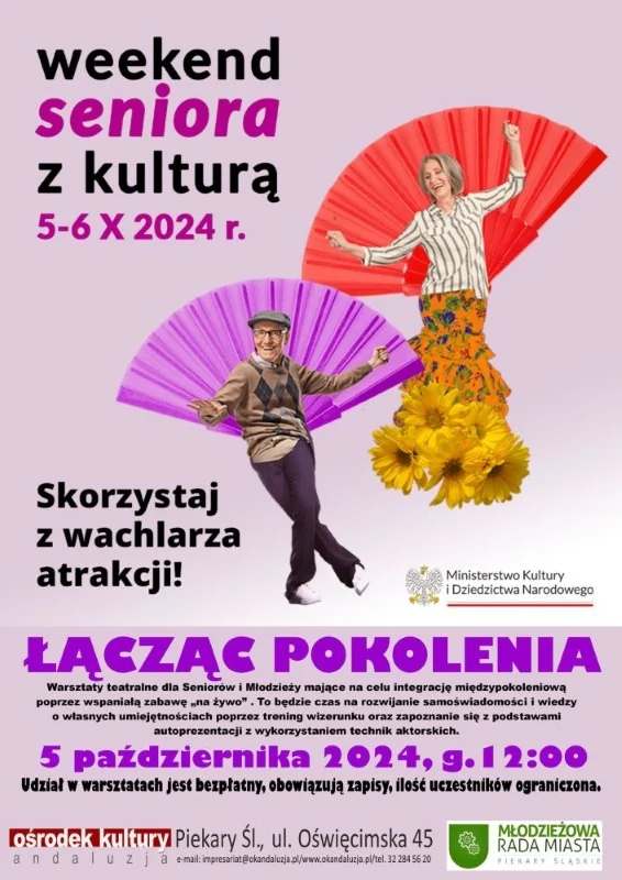 Ośrodek Kultury „Andaluzja” zaprasza seniorów oraz młodzież na warsztaty teatralne „Łącząc Pokolenia”, które odbędą się 5 października 2024 roku. Celem warsztatów jest integracja międzypokoleniowa poprzez wspólną zabawę oraz rozwijanie samoświadomości i umiejętności autoprezentacji. Uczestnicy będą mieli okazję poznać techniki aktorskie i zdobyć praktyczne umiejętności z zakresu komunikacji niewerbalnej oraz radzenia sobie ze stresem.