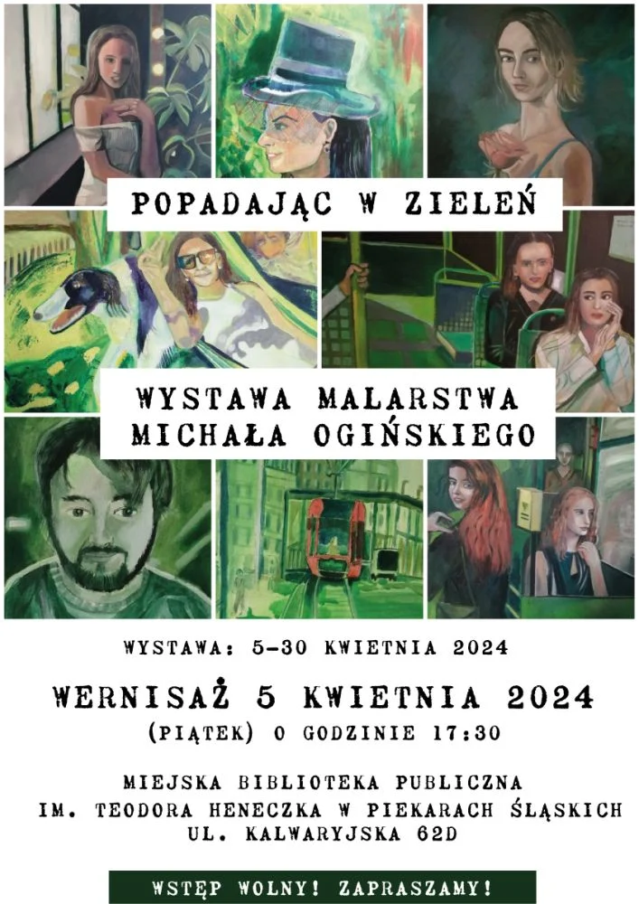 Miejska Biblioteka Publiczna im. Teodora Heneczka w Piekarach Śląskich informuje o wernisażu wystawy Michała Ogińskiego pt. „Popadając w zieleń”. Wydarzenie odbędzie się dzisiaj, 5 kwietnia o 17.30 Bibliotece Centralnej.