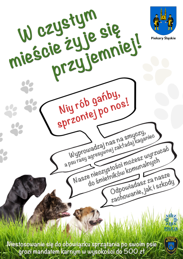 Przypomnijmy, że osoby utrzymujące zwierzęta domowe zobowiązane są do usuwania pozostawionych nieczystości w miejscach przeznaczonych do wspólnego użytku. Obowiązek ten wynika z Uchwały XXIX/359/16 Rady Miasta Piekary Śląskie z dnia 24 listopada 2016r.