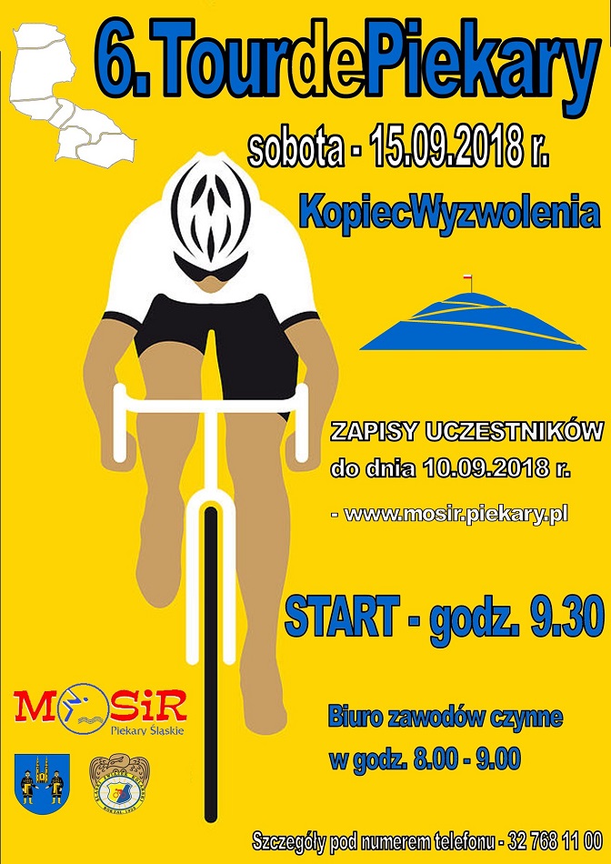 W sobotę 15 września Miejski Ośrodek Sportu i Rekreacji w Piekarach Śląskich organizuje szóstą edycję wyścigu rowerowego “TOUR DE PIEKARY”. Wyścig ten, jak co roku przeprowadzony zostanie na pętli rozpoczynającej i kończącej się przy Kopcu Wyzwolenia.