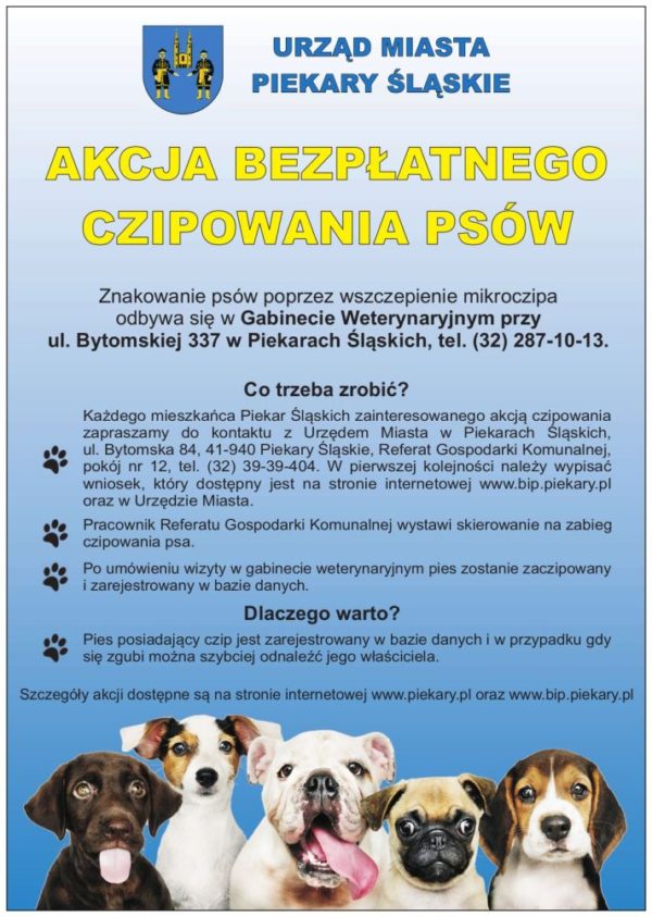 Pies posiadający czip jest zarejestrowany w bazie danych i w przypadku, gdy się zgubi, można szybciej odnaleźć jego właściciela bez konieczności wywożenia psa do schroniska. Akcja trwa do końca 2021 roku. Szczegóły akcji dostępne pod numerem telefonu: (32) 39-39-404 oraz w Programie opieki nad zwierzętami bezdomnymi, oraz zapobiegania bezdomności zwierząt na terenie Miasta Piekary Śląskie w 2021 roku.