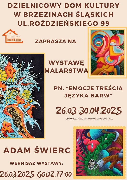 Dzielnicowy Dom Kultury w Brzezinach Śląskich zaprasza na wyjątkową wystawę malarstwa autorstwa Adama Świerca. Wystawa zatytułowana „Emocje Treścią Języka Barw” otwiera cykl wydarzeń artystycznych w mieście.