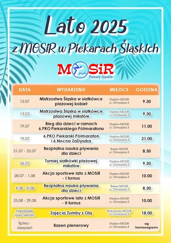 W Piekarach Śląskich wakacje zapowiadają się niezwykle sportowo! MOSiR przygotował szereg atrakcji w ramach Sportowego Lata 2025, które będą miały miejsce w różnych terminach. Od turniejów siatkówki plażowej, przez półmaraton, aż po naukę pływania i Zumbę – każdy znajdzie coś dla siebie! Sprawdź, co czeka na Ciebie tego lata!
