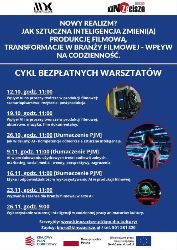 Piekarskie Kino Zacisze zaprasza na bezpłatne warsztaty adresowane głównie do osób zainteresowanych tematyką IT oraz zawodową, profesjonalną bądź amatorską realizacją filmu z wykorzystaniem najnowszych narzędzi AI. Projekt jest realizowany w ramach pierwszego naboru Krajowego Planu Odbudowy do programu wspierania działalności podmiotów sektora kultury i przemysłów kreatywnych na rzecz stymulowania ich rozwoju.