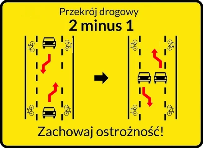 Droga tego typu składa się z jednej dwukierunkowej jezdni na środku przeznaczonej dla kierujących samochodami i motocyklami oraz osobnych pasów bocznych (tzw. opasek) dla rowerzystów. Na drodze “2 minus 1” obowiązują specjalne zasady, które pozwalają kierowcom najechać na pasy boczne podczas wymijania. Pojazdy silnikowe nie mogą stwarzać zagrożenia dla innych, a rowerzyści mają pierwszeństwo przed użytkownikami samochodów i motocykli. Ruch pieszych odbywał się będzie jak dotychczas chodnikami.