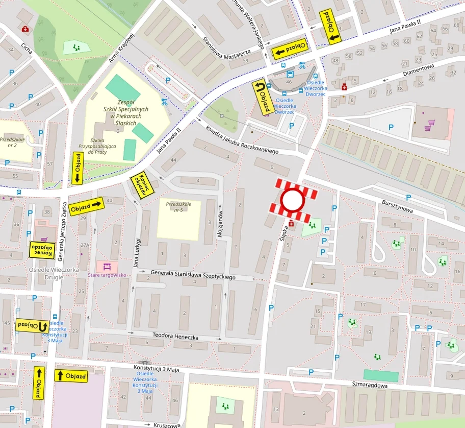 Dojazd do ulic prostopadłych takich jak Teodora Heneczka, Szmaragdowa, i Bursztynowa pozostanie bez zmian. Wyłączony zostanie jedynie fragment ul. Śląskiej, zaznaczony na mapie. Zalecany objazd prowadzi przez ul. Konstytucji 3 Maja, ul. Papieża Jana Pawła II oraz ul. Gen. Jerzego Ziętka.