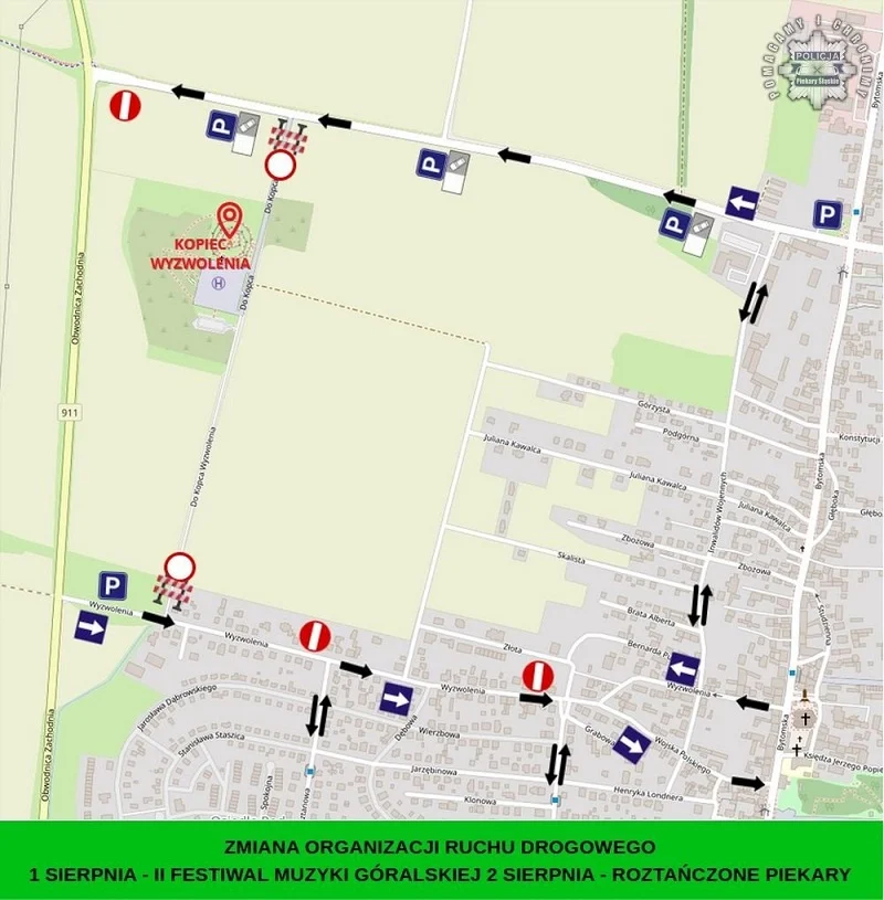 Ponadto, na ul. Wyzwolenia obowiązywał będzie ruch jednokierunkowy z kierunkiem jazdy od drogi 911 do ul. Chopina. Ulica Do Kopca Wyzwolenia zostanie całkowicie wyłączona z ruchu – obowiązywać będzie zakaz wjazdu.