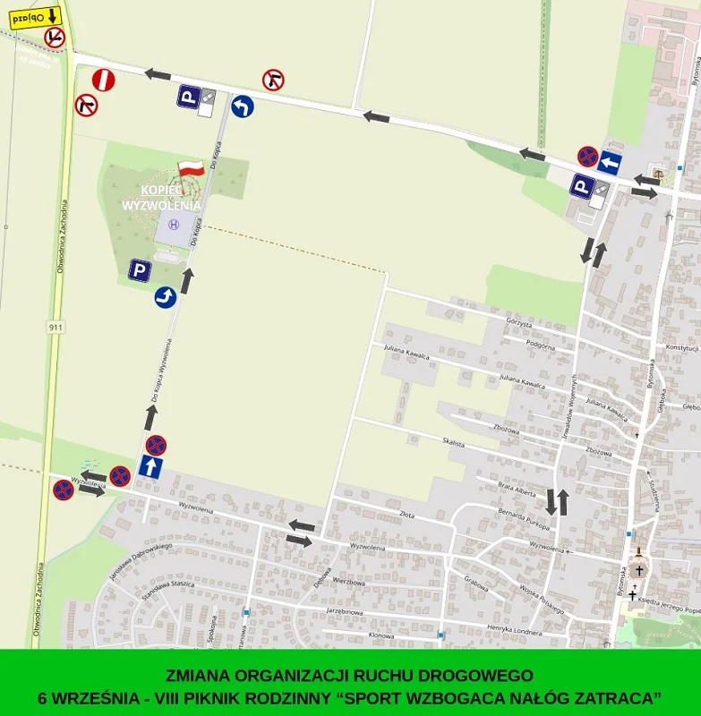 Na ul. Jana Pawła II parkowanie skośne będzie możliwe na lewej części jezdni (w kierunku DW 911). Dodatkowe miejsca przygotowano także na dolnym parkingu polnym pod Kopcem Wyzwolenia. Kierowcy proszeni są, by po zakończonej imprezie jak najszybciej zwalniać miejsca, co ułatwi przywrócenie ruchu dwukierunkowego.