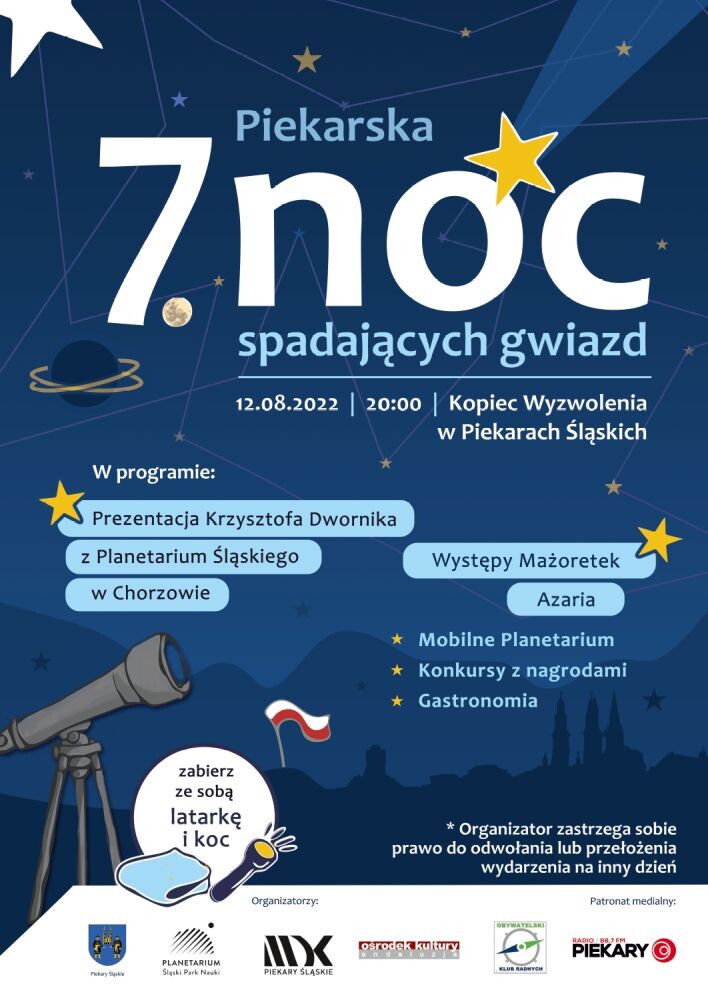 W piątkową noc 12 sierpnia odbędzie się 7. Piekarska Noc Spadających Gwiazd, kiedy przypada największe nasilenie roju meteoroidów zwanych Perseidami oraz w tym roku także pełnia Księżyca.