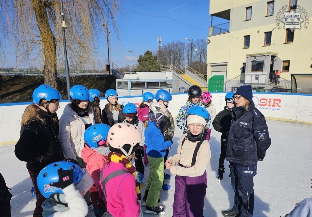 W ramach akcji #bezpieczneferie piekarscy policjanci odwiedzili dzieci korzystające z lodowiska Miejskiego Ośrodka Sportu i Rekreacji w Piekarach Śląskich. Podczas spotkania najmłodsi brali udział w dyskusjach o bezpiecznym korzystaniu z lodowiska oraz o zasadach obowiązujących podczas pobytu w domu bez nadzoru dorosłych.
