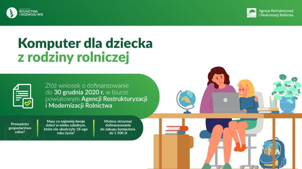 Rodzina prowadząca gospodarstwo rolne, w skład której wchodzi co najmniej dwoje dzieci w wieku szkolnym, które nie ukończyły 18-ego roku życia może ubiegać się od dofinansowanie zakupu komputera stacjonarnego lub przenośnego do kwoty 1 500 zł.