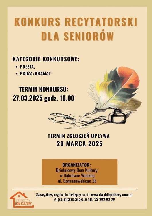 Dzielnicowy Dom Kultury w Dąbrówce Wielkiej po raz dziewiąty zaprasza seniorów do udziału w Konkursie Recytatorskim, który odbędzie się 27 marca o godzinie 10:00. Wydarzenie skierowane jest do osób powyżej 60. roku życia, które chcą podzielić się swoją miłością do literatury oraz sprawdzić swoje umiejętności interpretacyjne.