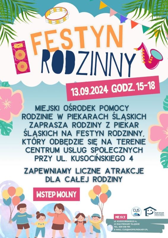 W piątek, 13 września, Miejski Ośrodek Pomocy Rodzinie w Piekarach Śląskich serdecznie zaprasza wszystkich mieszkańców Piekar Śląskich na wyjątkowy festyn rodzinny, który odbędzie się na terenie Centrum Usług Społecznych przy ulicy Kusocińskiego 4. Wydarzenie rozpocznie się o godzinie 15:00 i potrwa do 18:00.