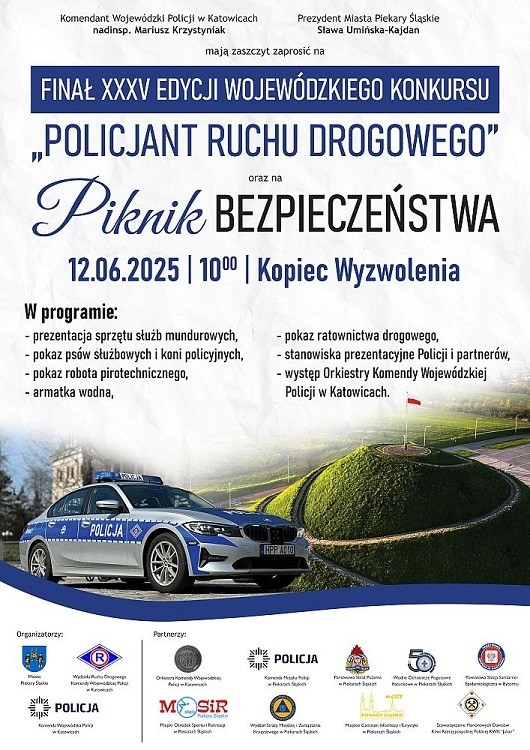 Już 12 czerwca w Piekarach Śląskich odbędzie się wyjątkowe wydarzenie – Finał XXXV edycji Wojewódzkiego Konkursu „Policjant Ruchu Drogowego”. Prezydent Miasta Piekary Śląskie, Sława Umińska-Kajdan, oraz Komendant Wojewódzki Policji w Katowicach, nadinsp. Mariusz Krzystyniak, zapraszają na tę emocjonującą rywalizację, która połączona będzie z Piknikiem Bezpieczeństwa. Wydarzenie odbędzie się na terenie wokół Kopca Wyzwolenia od godziny 10:00.