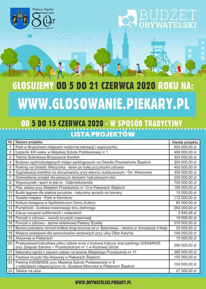 Znamy już ostateczną listę projektów, które zostaną poddane pod głosowanie w tegorocznej edycji Piekarskiego Budżetu Obywatelskiego!