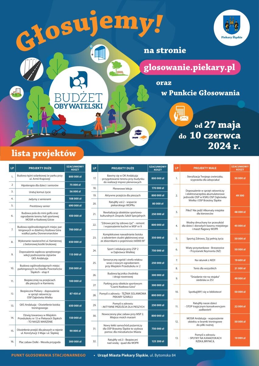 27 maja 2024 r. startuje tegoroczne głosowanie w ramach Budżetu Obywatelskiego. Głosować można internetowo na stronie glosowanie.piekary.pl lub w sposób tradycyjny poprzez złożenie wypełnionej karty do urny w Urzędzie Miasta. Do wyboru jest 45 projektów z czego 32 w puli projektów dużych i 13 w puli projektów małych. To od Was zależy ostateczny decyzja. Głosowanie potrwa do 10 czerwca!