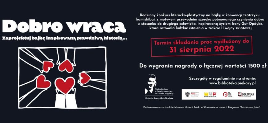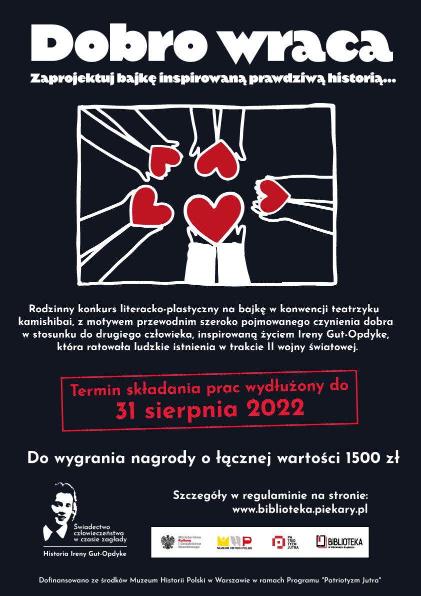 Miejska Biblioteka Publiczna im. Teodora Heneczka w Piekarach Śląskich zaprasza do udziału w rodzinnym konkursie literacko-plastycznym pt. “Dobro wraca”. Celem konkursu jest upowszechnienie wiedzy o życiu Ireny Gut-Opdyke – z zaszczytnego grona ok. 7 tys. Polaków odznaczonych tytułem Sprawiedliwych Wśród Narodów Świata – która z narażeniem życia ratowała Żydów przed zagładą w trakcie II wojny światowej.
