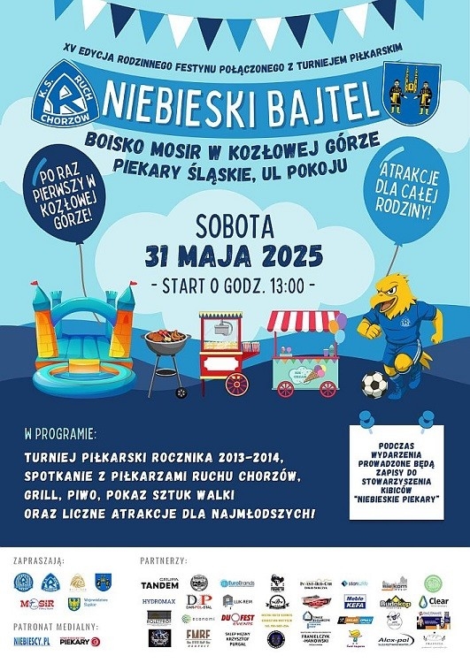 W sobotę 31 maja odbędzie się XV edycja Festynu Rodzinnego „Niebieski Bajtel”, organizowanego przez Stowarzyszenie Kibiców „Niebieskie Piekary”. Tegoroczna impreza po raz pierwszy zawita na boisko MOSiR w dzielnicy Kozłowa Góra. W programie turniej piłkarski dla młodych zawodników z roczników 2013-2014, którzy powalczą o puchar Niebieskiego Bajtla.