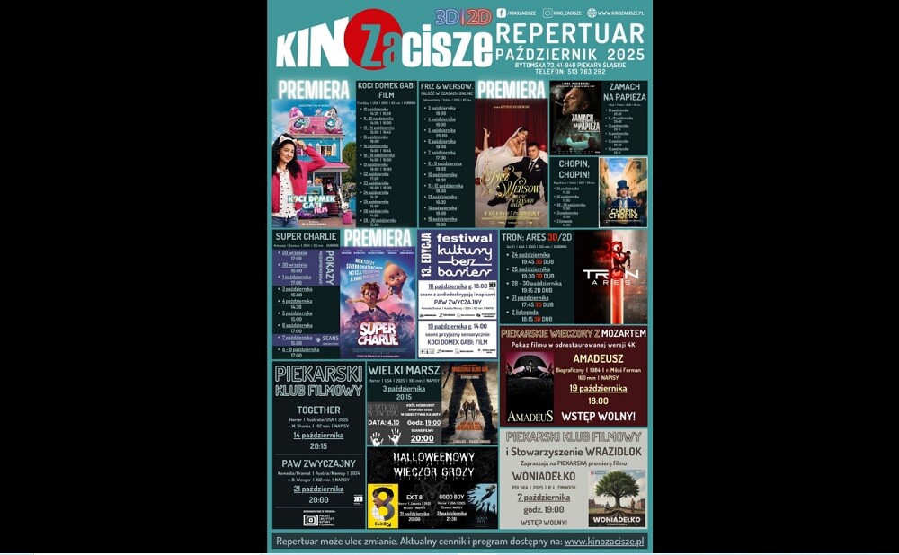 Październik w Kinie Zacisze to miesiąc pełen filmowych atrakcji. Dla miłośników kinematografii czekają wyjątkowe pokazy specjalne, premiery rodzimych produkcji oraz wydarzenia związane z tematyką Halloween i Festiwalem Kultury Bez Barier. Warto zaplanować wizytę w piekarskim kinie, aby nie przegapić żadnej z nadchodzących premier.