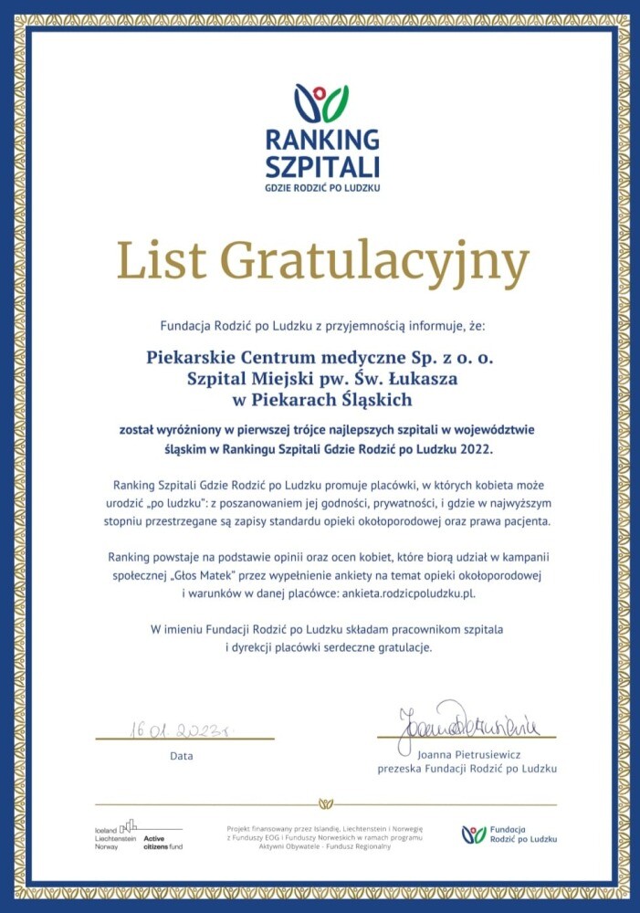 Po raz kolejny Fundacja "Rodzić po ludzku" opublikowała ranking najlepszych szpitali z oddziałami położniczymi, które polecają inne matki, pacjentki tych placówek. Ranking powstał na podstawie ankiet “Głos Matek”, wypełnianych przez kobiety po porodzie. Piekarskie Centrum Medyczne Szpital Miejski pw. Św. Łukasza znalazł się w pierwszej trójce najlepszych szpitali położniczych w województwie śląskim, tuż za Szpitalem Położniczo-Ginekologicznym Łubinowa w Katowicach oraz Szpitalem w Knurowie i uplasował się w pierwszej dziesiątce szpitali najwyżej ocenionych przez matki w skali całego kraju.