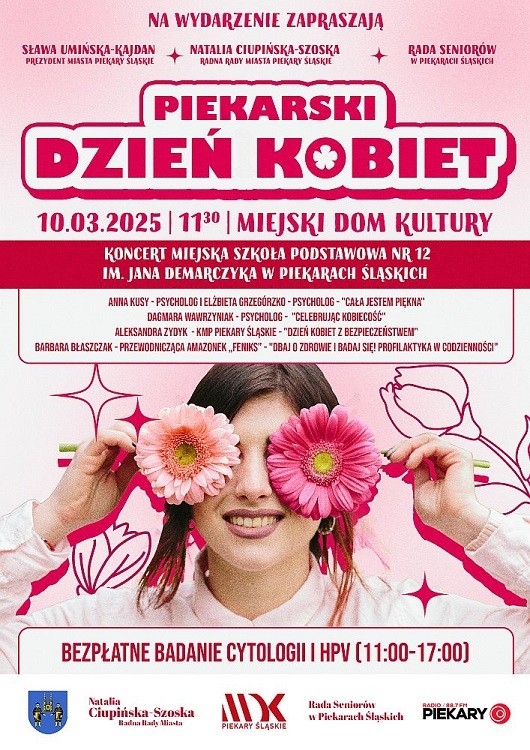 Sława Umińska-Kajdan, Prezydent Miasta Piekary Śląskie, Natalia Ciupińska-Szoska, radna Rady Miasta, oraz Rada Seniorów w Piekarach Śląskich zapraszają serdecznie na Piekarski Dzień Kobiet, który odbędzie się 10 marca o godz. 11:30 w Miejskim Domu Kultury.