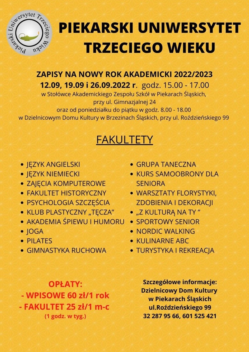 Spotkania wraz z możliwością zapisania się na nowy rok akademicki odbędą się w stołówce Akademickiego Zespołu Szkół przy ul. Gimnazjalnej 24 w godz. 15.00 – 17.00 w poniedziałki: 12, 19, 26 września br. Ponadto organizatorzy zapraszają również do Dzielnicowego Domu Kultury w Brzezinach Śląskich przy ul. Roździeńskiego 99 od poniedziałku do piątku w godz. 8.00 – 18.00.