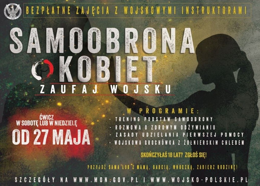 Ministerstwo Obrony Narodowej wraz z Centralnym Wojskowym Centrum Rekrutacji i Dowództwem Generalnym Rodzajów Sił Zbrojnych organizuje bezpłatne szkolenia z samoobrony dla dorosłych Polek.